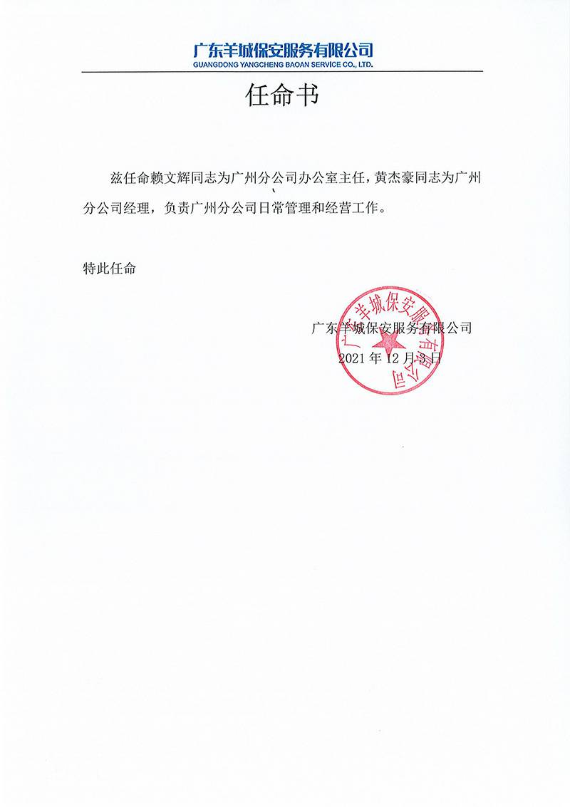 吉林刘洋运动健康管理有限公司关于黄杰豪与赖文辉的任命书正式通知
